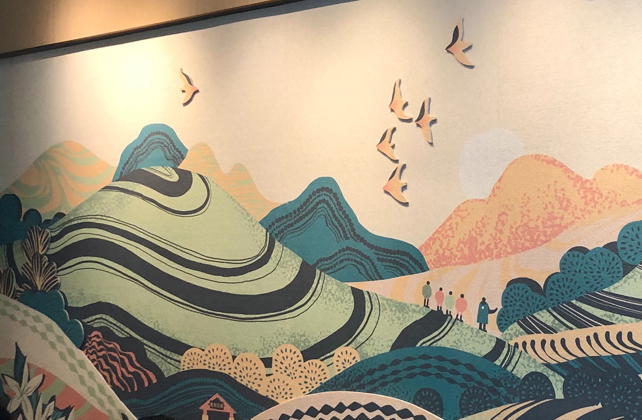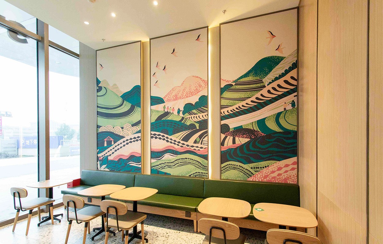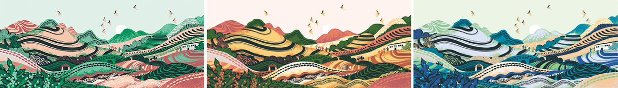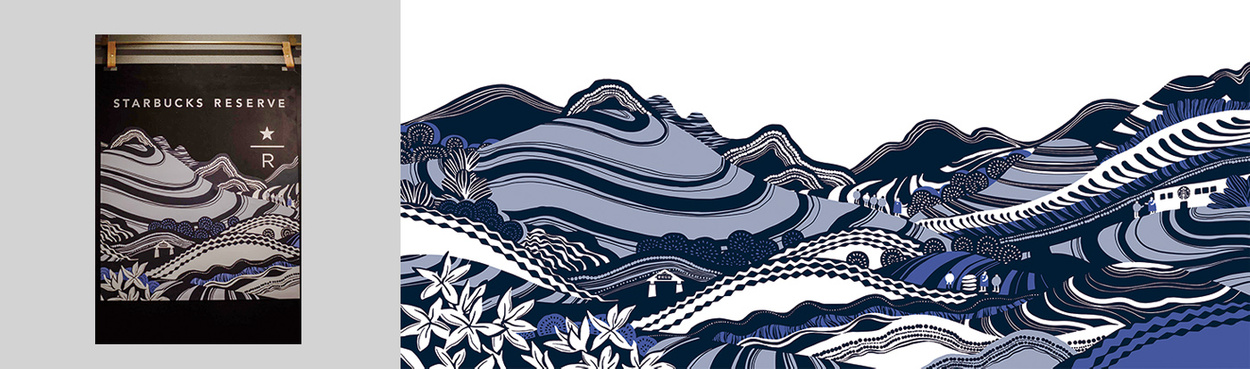 这是星巴克为其特别设计的标准艺术作品——云南系列。在层叠的梯田和山巒之间,作品展现了农艺师与咖农们在咖啡庄园中的互动。系列包含六款色系,以咖啡树的生长季节为主题,描绘了从花朵到果实的成长过程,也包括咖啡果采收后的检测、日晒以及运输到城市的过程。该系列作品目前已在多个星巴克门店中展示