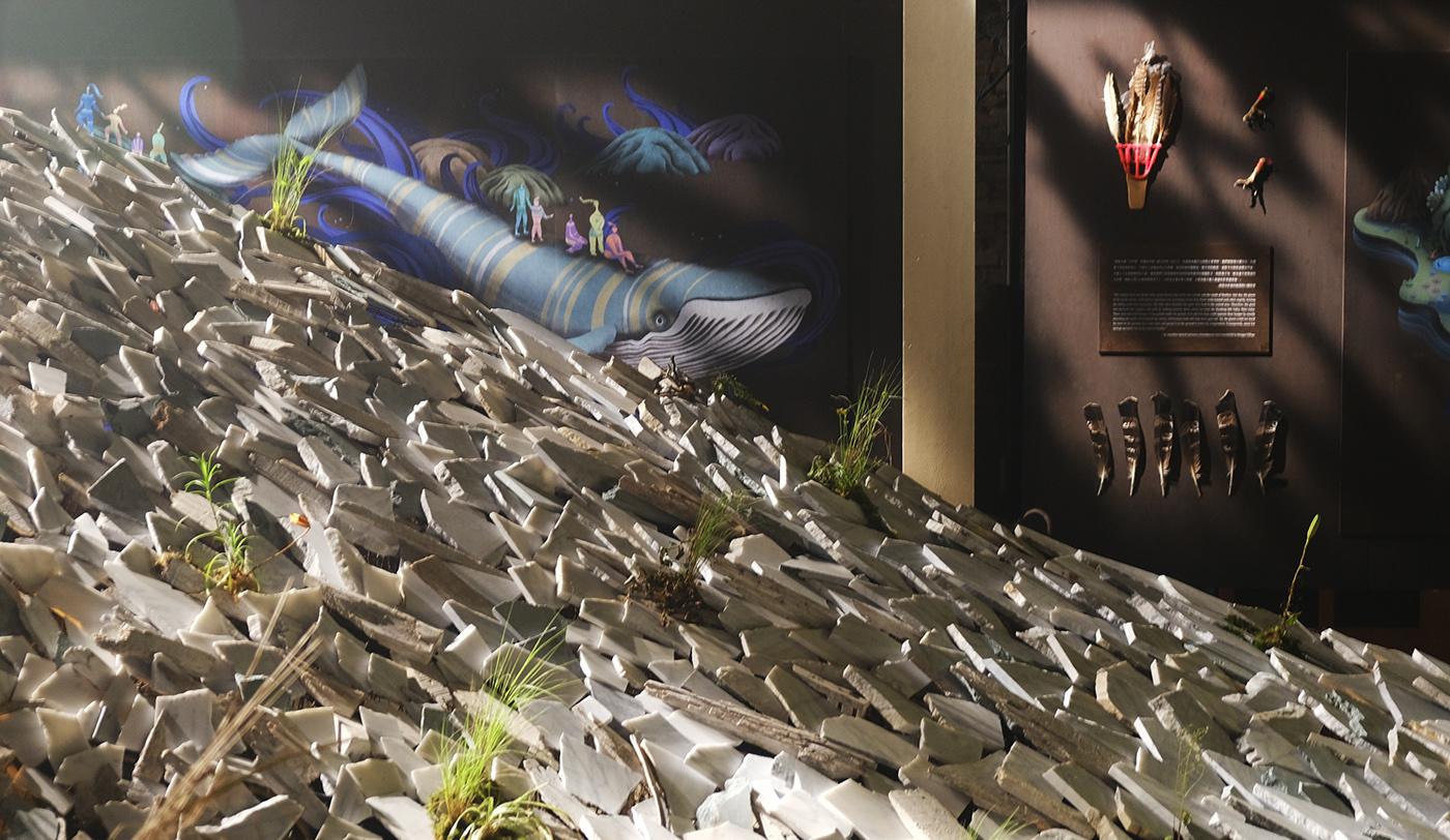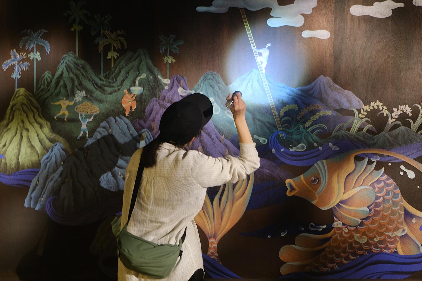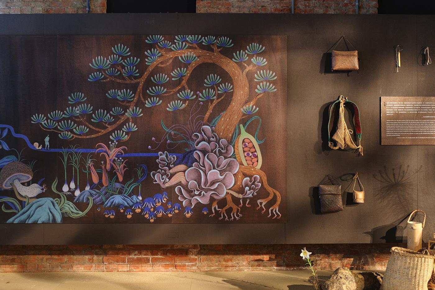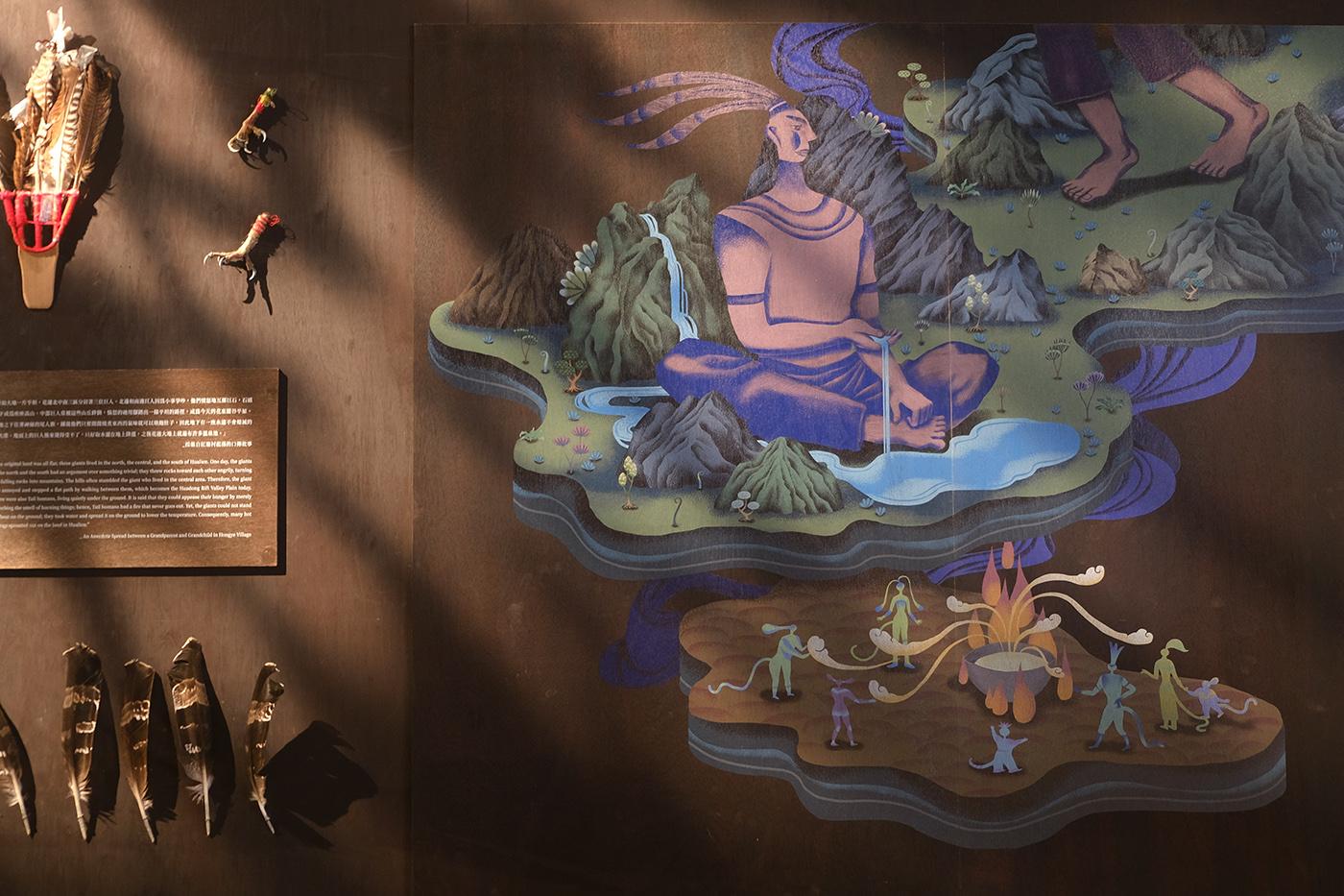 2021 台湾文博会花莲县馆-据说考古队。六个花莲神话传说壁画绘制。由偶然设计团队的文字故事进行创作发想,在展馆中与策展团队的空间、风土、故事、互动、采集物件、植栽、光影、声音、气味及互动艺术装置相互搭配,让观众进入花莲的故事。