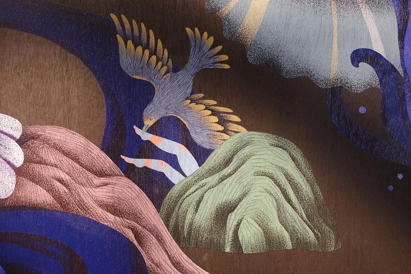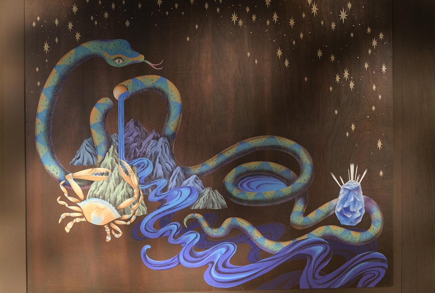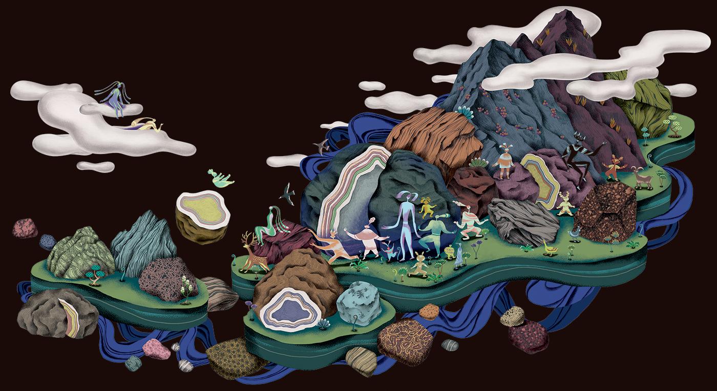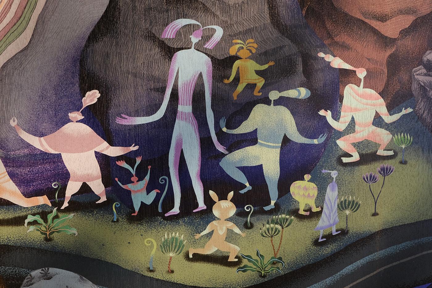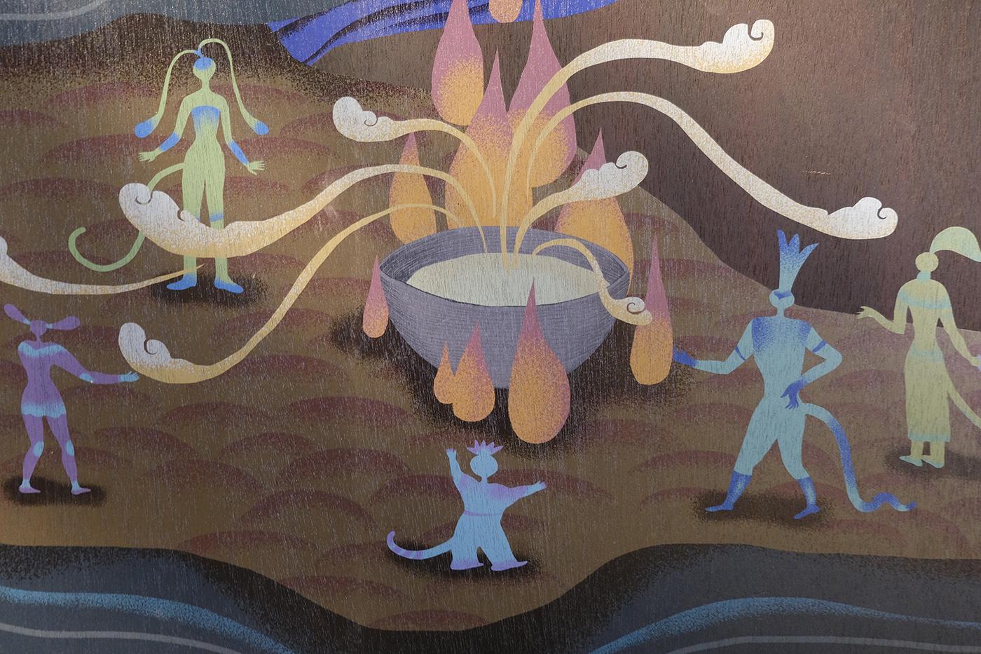 2021 台湾文博会花莲县馆-据说考古队。六个花莲神话传说壁画绘制。由偶然设计团队的文字故事进行创作发想,在展馆中与策展团队的空间、风土、故事、互动、采集物件、植栽、光影、声音、气味及互动艺术装置相互搭配,让观众进入花莲的故事。