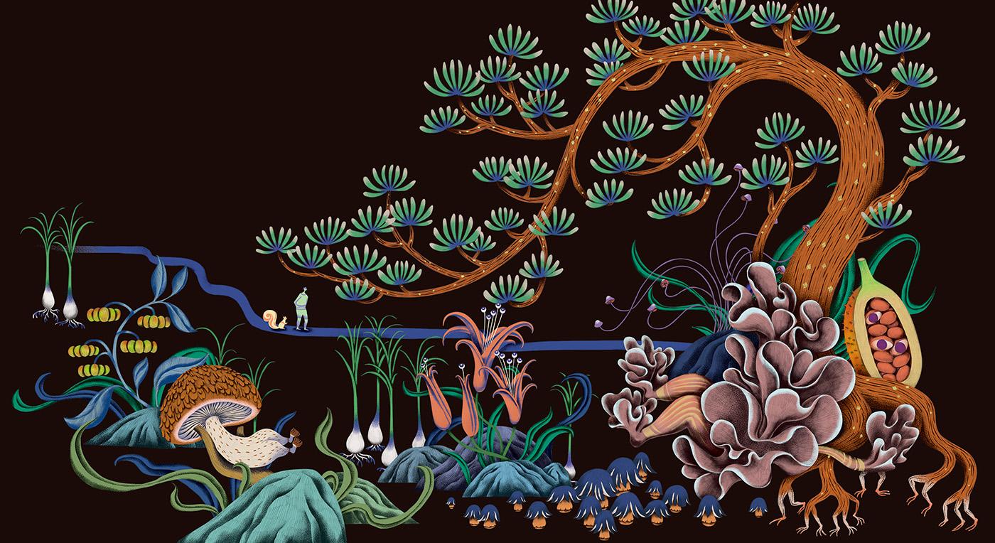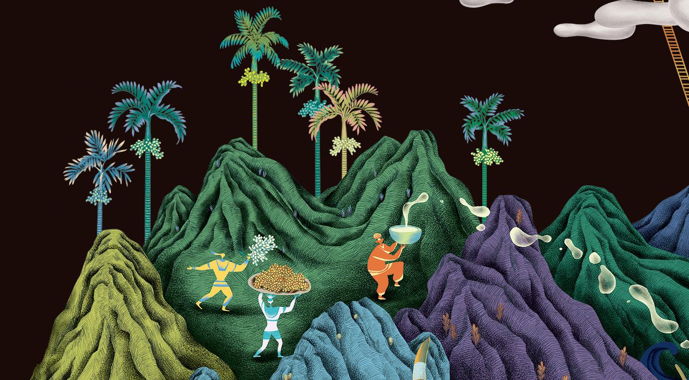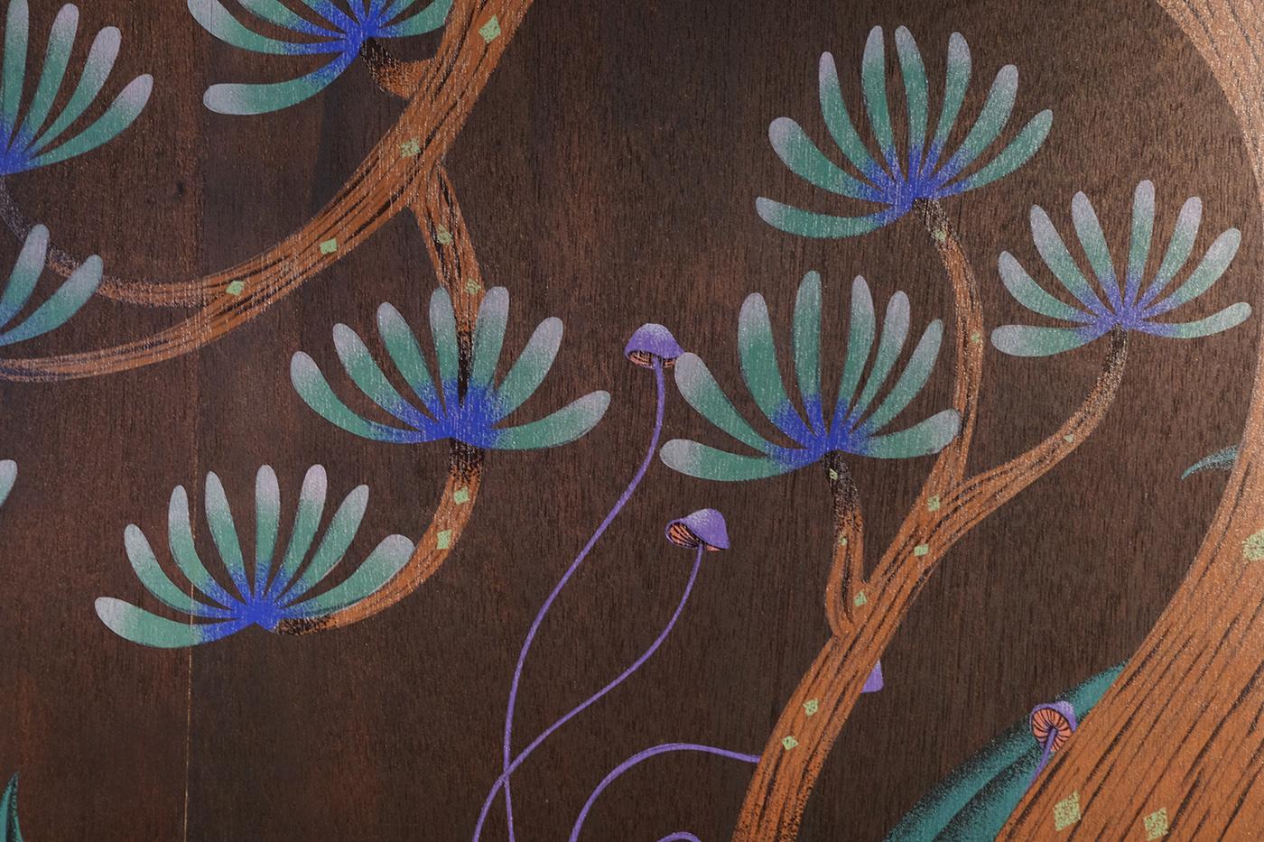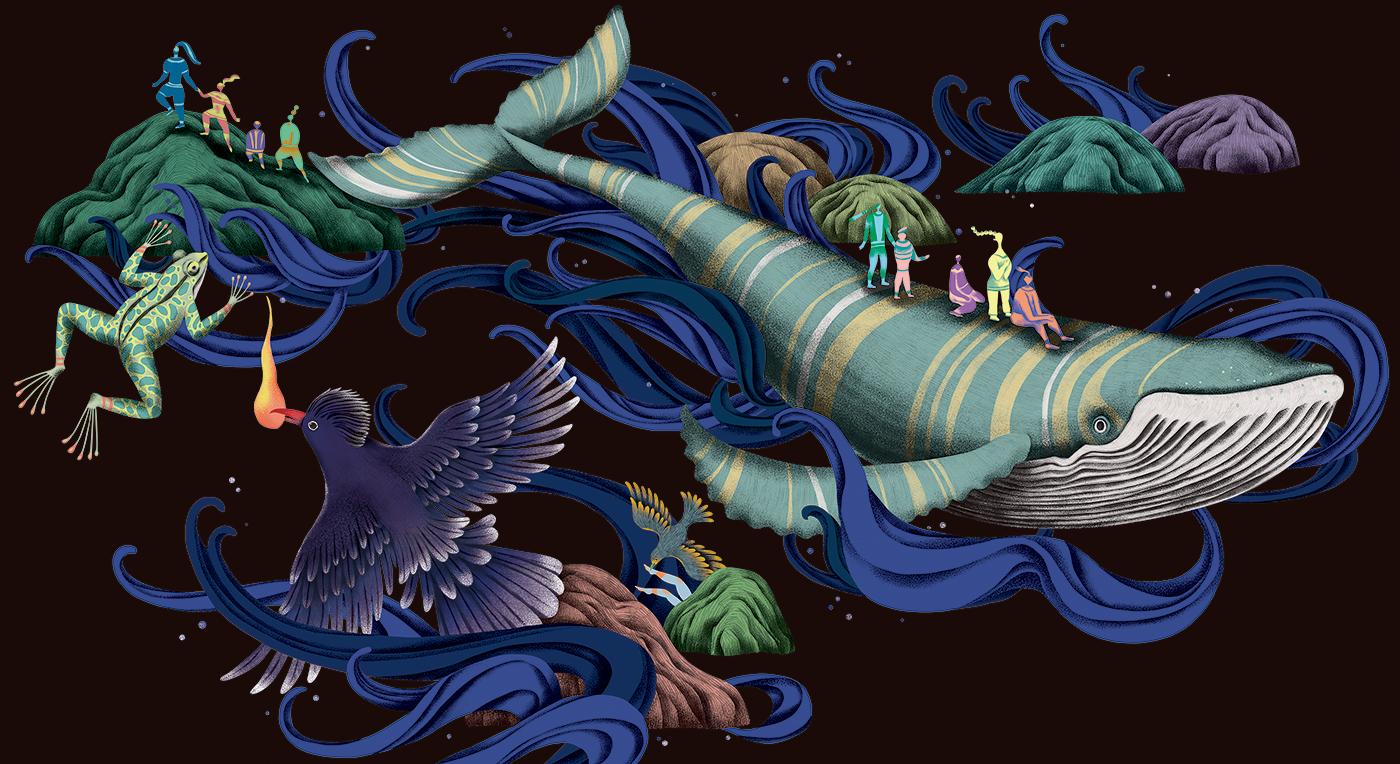 2021 台湾文博会花莲县馆-据说考古队。六个花莲神话传说壁画绘制。由偶然设计团队的文字故事进行创作发想,在展馆中与策展团队的空间、风土、故事、互动、采集物件、植栽、光影、声音、气味及互动艺术装置相互搭配,让观众进入花莲的故事。