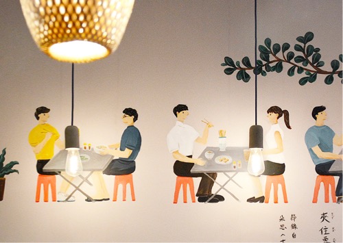 品牌:Bopome巴黎餐厅艺术家:Yu-Hsuan Wang为在巴黎圣马丁运河附近的一间台湾小餐厅, 主打卷饼与咸酥鸡等各式小点,也会推出每日特餐。作品为墙面彩绘,并节录了朵思的诗, 以台湾的街头美食为主题,绘制大家在路边吃东西的情景。了解更多 -