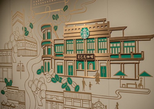 品牌:星巴克北京前门店艺术家:Yu-Hsuan Wang为星巴克前门店所创作的墙面作品。将北京前门大街上的特色,如铛铛车、大栅栏及街道上的建筑物等结合于画面中,而人们跟着咖啡豆聚集到了星巴克。了解更多 -